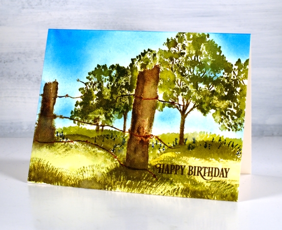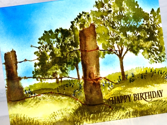 Another stamped scene, this one a little closer to home than the desert in the previous post. I paired the PB ‘arbor’ and ‘snow fence’ stamps to create a pastoral scene. I worked on hot pressed watercolour paper using distress inkpads and markers as my ‘watercolour paints’.