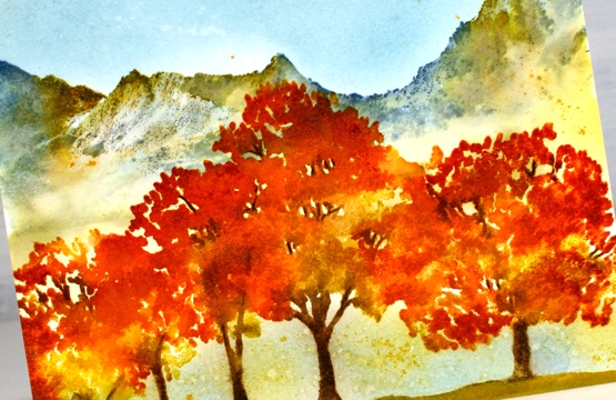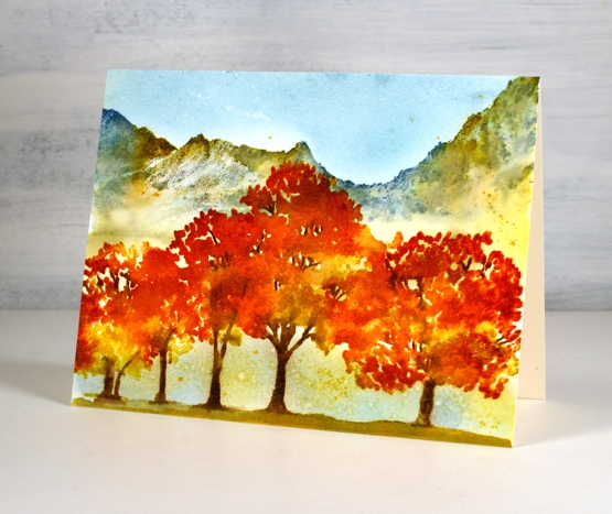 The first step in creating this scene was to stamp the top half of the mountain stamp (PB picturesque) in faded jeans and speckled egg distress inks on hot pressed watercolour paper. I painted below the mountains with water softening the colours at the bottom so there was no distinct line where the mountains ended. I then painted over the top of the mountains with water and dropped some spiced marmalade, forest moss and ground espresso ink into the wet area to add colour.