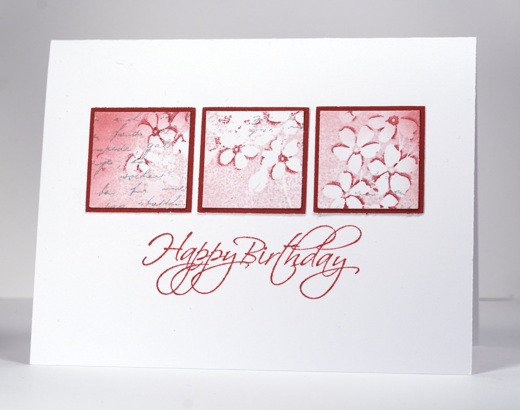 Posted: February 27, 2013 Filed under: Background Stamps, CAS, Glory of Modesty, Penny Black 15 CommentsWhen I was creating the background stamp tutorial my first attempt was almost complete when I messed up the sentiment. No point letting those pretty flowers go to waste so I punched them out and used the three element in a row layout that Susan Raihala says is her all time favourite layout.
