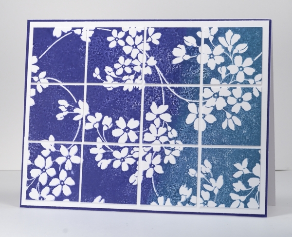 My top card was made by sponging through a couple of masks cut with the blissful die and three different memento inks (listed below). The popped up tiles on the card below were made using the emboss resist method and the same three inks.