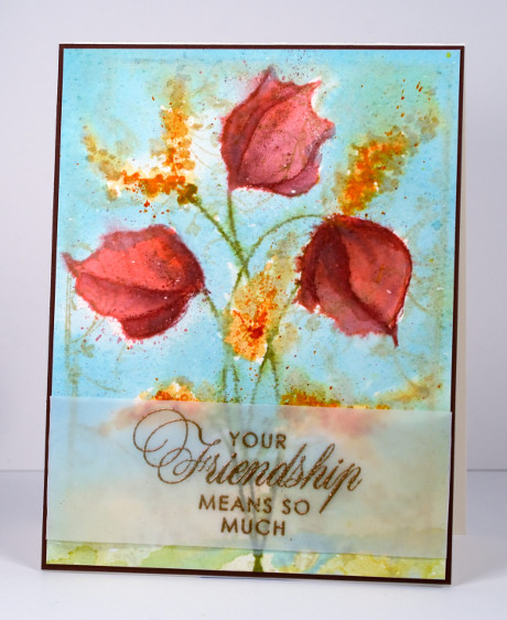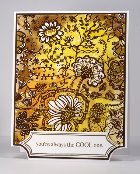 I created this card from a stamped panel that was sitting around on my work table waiting for inspiration. I stamped the “Floral Tapestry” background stamp in Distress stains on watercolour paper. After stamping once I spritzed the stamp and stamped again on another piece of paper, then did it again so I had several panels sitting around, each one a little paler than the previous one. I think this one was the palest panel but it still had plenty of colour and the negative images of the flowers and leaves were clear enough to doodle around. If you watch the video you will see my doodling process. I did not have a plan; I just defined the flower shapes and added leaves, twirls and squiggles in and around them. When I was almost finished I decided a few gold highlights would be nice so I added them with a Wink of Stella pen.