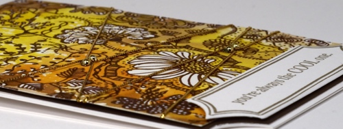 I trimmed the floral panel and criss-crossed some gold cord over it. I added two gold half pearls in each place where the cord crossed and stuck the cord down with glossy accents. The cord did not want to stay in place but with a little pressure on top it finally did! After die-cutting the banner I decided to trim the dark brown mat and cardbase to co-ordinate.