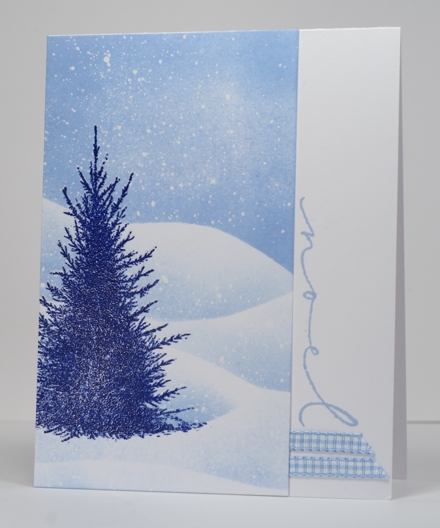 - remove mask, sponge the snow around the bottom of card and stamp foreground tree in blue.