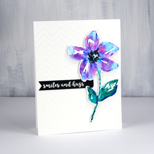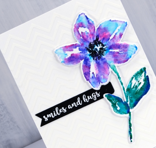 Posted: May 21, 2018 Filed under: A Pocket Full, belle, Foiling, Zigs & zags | Tags: Kuretake Zig clean color real brush markers, Minc, Penny Black creative dies, Penny Black stamps, WOW embossing powders 4 CommentsThe zigs & zags stencil has popped up again today as a background for this die cut and watercoloured flower. I applied deco transfer gel directly to my card base (neenah solar white 110lb) then ran it through my minc with white foil. The result is a subtle chevron background. I wanted my flower to match the white card base exactly so I used the same neenah solar white which meant I did not add much water at all when blending my zig pens after stamping. I used a mix of blue, pink and purple and a blue/green combo on the leaves and stem then just a damp brush to blend with water. I made sure the blending was dry before stamping the black centre several times then used the co-ordinating die to cut out the flower plus a white foam one to pop it up over the background.