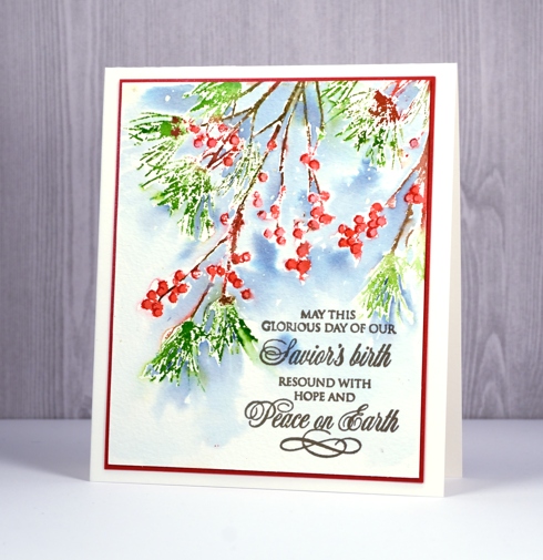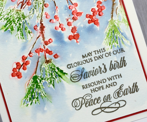 Once all the ink and stain was dry I added definition to the berries with a candied apple distress marker. I removed the masking fluid to reveal little white dots, added the sentiment in smokey gray versafine ink and matted the panel in red.