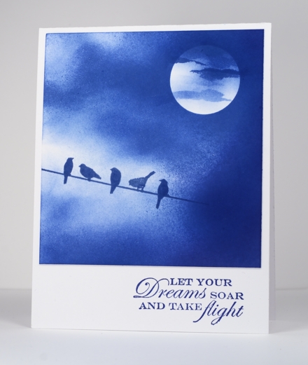 The sky took a while to build up as I sponged from the outside in, with three blues. I used a little light blue at the beginning, the darkest blue at the end but the majority of the sponging was done with Memento Danube Blue. I positioned the moon mask first and stamped the birds before I did any sponging so that I could vary the depth of colour around the image. After I removed the moon mask I tore little strips out of the sticky part of a post-it note to create a very thin cloud like shape.