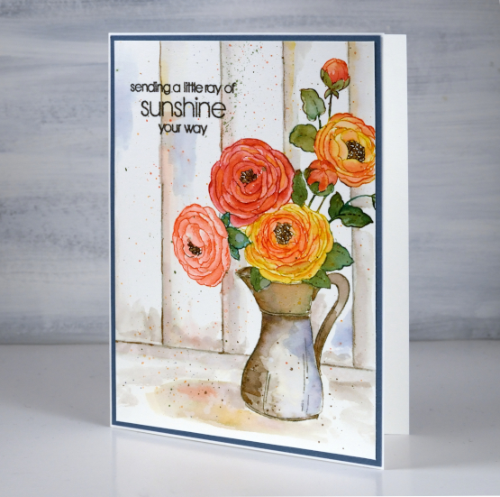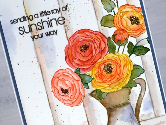 Once the jug and flowers were complete I painted a shadow underneath with pumice stone ink then dropped some of the flower and jug colours into the wet shadow. To ground the image I ruled both a base line then vertical ‘wood panel’ lines with a t-ruler in pumice stone ink. I used pumice stone ink to paint shadow and shading on the wood then realised I needed another colour to lift the whole vintage toned panel. I chose chipped sapphire ink to add some blue to the panels and the jug as it is the complement to yellow mustard seed ink used on the flowers. It definitely made a difference so I stayed with the blue in choosing a dark blue cardstock to frame the panel. (I demonstrate how I make colour choices for stamping and painting in my online class COLOUR CLUES) I finished the card with by adding splatter and a sentiment from the new PB ‘thinking of you’ set.