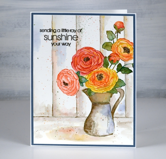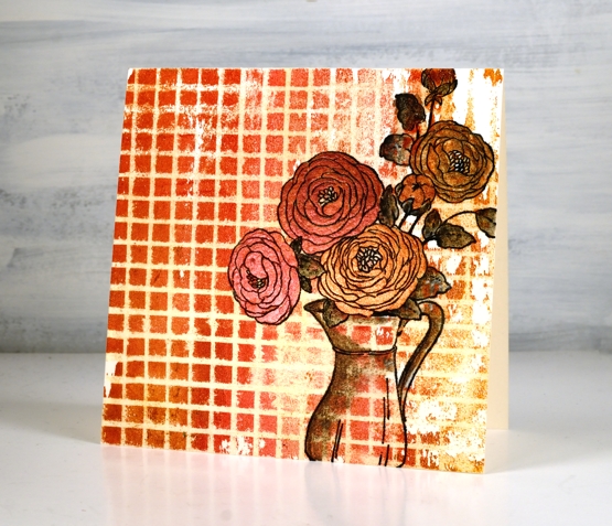 To begin I stamped the whole image on hot pressed watercolour paper in papertrey soft stone ink. I chose mustard seed and abandoned coral distress inks to make colour blends to paint all the flowers and buds. I used a mix of pine needles and forest moss inks for the leaves and stems then stamped and painted the flower centres with gathered twigs ink. For the look of an old metal or ceramic jug I used pumice stone and gathered twigs inks doing some restamping and blending with both inks to define and fill the jug.