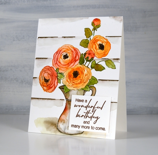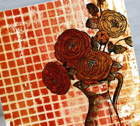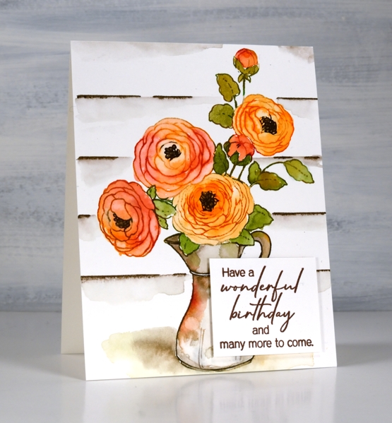 Today’s jug of flowers is yet another lovely floral from the new Penny Black ‘Delight’ release. I went for something of a vintage effect with this one by painting the jug in muted brown and grey tones and adding some woodwork in the background.