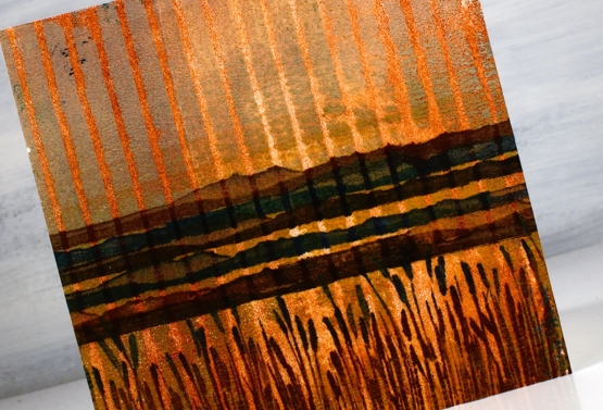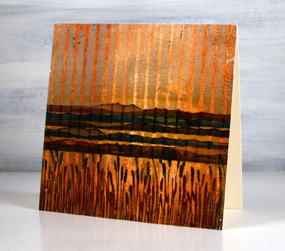 You can see how I printed this panel in the video. To turn it into a card I used a couple of new stamps from Penny Black. I stamped the mountain stamp five times in browns and blue then inked the rushes with a brown and a blue ink. I love the way it looks like a sunset or sunrise because of the background print. It wasn’t something I tried to create but a possibility I saw when looking at the prints.