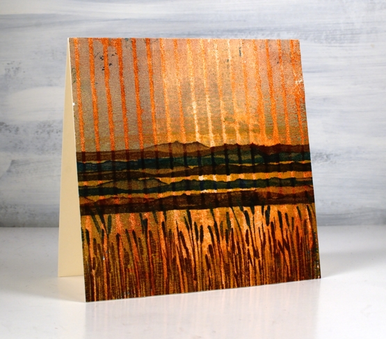 You can see how I printed this panel in the video. To turn it into a card I used a couple of new stamps from Penny Black. I stamped the mountain stamp five times in browns and blue then inked the rushes with a brown and a blue ink. I love the way it looks like a sunset or sunrise because of the background print. It wasn’t something I tried to create but a possibility I saw when looking at the prints.
