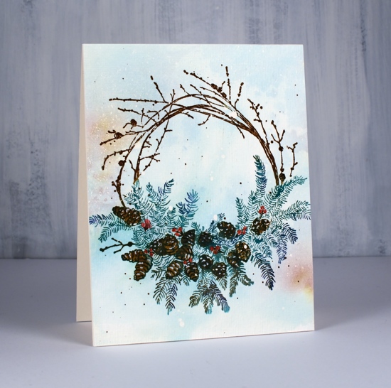 Once the background ink dried I used the stamp positioner to stamp the wreaths colour by colour using pine needles and forest moss distress inks for the foliage, gathered twigs and black soot for the twigs and pine cones and chipped sapphire for some added depth. I drew a few berries on the wreath below with a festive berries marker then painted over them with red from the finetec pearlescent paint set.