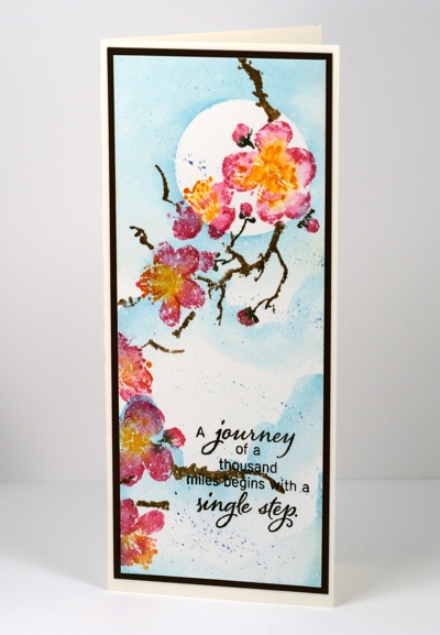 Posted: May 18, 2015 Filed under: Delicate Blossoms | Tags: Kuretake Gansai Tambi watercolour paints, Penny Black stamps, Tsukineko Memento inks 9 CommentsI have been creating cards with the delicate blossoms stamp quite a bit lately. I think my favourite so far is one I did for the Dirty Dozen on Splitcoast so you need to be a fan club member to view that one. I will also be using the stamp in my upcoming class which has an oriental theme running through it.