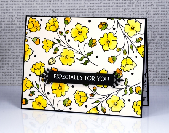 To complete the card I stamped a sentiment on a fancy little die cut banner and popped it up over the stem of the flower.