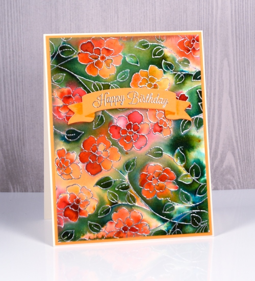 I let the panel dry naturally then trimmed it and matted with orange cardstock. I cut a curved banner from the new set ‘birds & banners‘ and embossed one of the co-ordinating stamps from the ‘banner sentiments‘ set in silver. The die cut banner looks folded so I used a marker to add a little shadow to the areas which appear to be behind the main section. I cut the same banner from orange fun foam so I could pop my sentiment up on the floral panel.