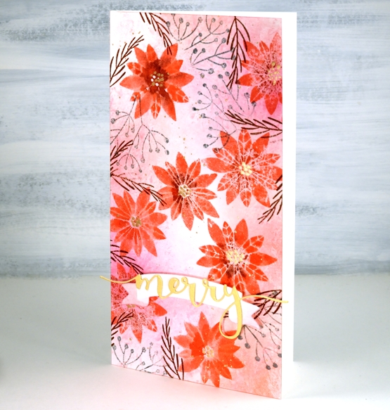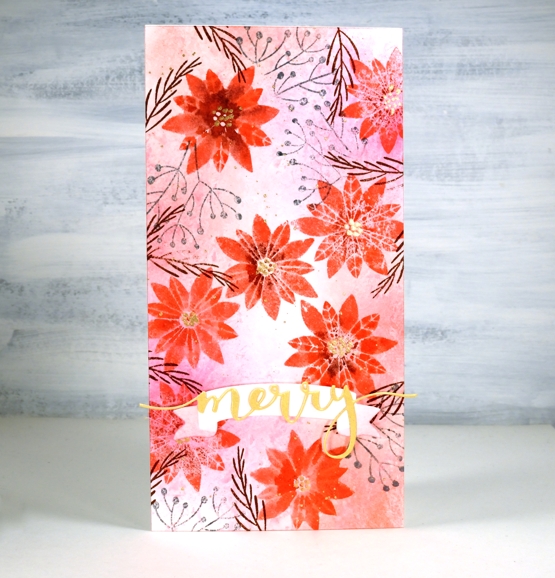 Posted: April 19, 2017 | Author: Heather | Filed under: birds and banners, Felicity | Tags: Brusho, Penny Black creative dies, Penny Black stamps, WOW embossing powders | 17 CommentsToday’s card looks like it was created with a background stamp, which is practically the case, but not quite. I used the new slapstick cling stamp, ‘Felicity’ and stamped it twice to more than fill a card front. The stamp is actually longer than my average card but a bit narrower. The organic arrangement of the flowers made it easy to stamp it twice and make it look like one big image. I stamped in versamark ink then embossed in silver powder on hot pressed watercolour paper. I taped it down then spritzed all over the panel with water. It wasn’t soaking wet but it was wet enough that the brusho I sprinkled on next started reacting straight away. I picked up some more brusho colours the other day to expand my collection and three out of four on this card are new to me. I sprinkled orange, sandstone and rose red over the flowers, spritzed again, tilted the panel to move the water and waited to see if I needed more. I did this a few times then switched over to sprinkling the olive green brusho over the rest of the panel. The olive green was more intense and the leaves on the panel are small so some areas got very dark, very quickly. I used a folded paper towel to remove liquid and colour where there was too much. I also tilted the panel so colour would flow down towards the closest embossed barrier which makes for nice dark contrasting areas next to some of the silver embossing.