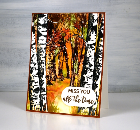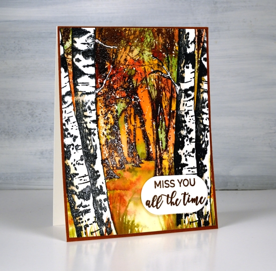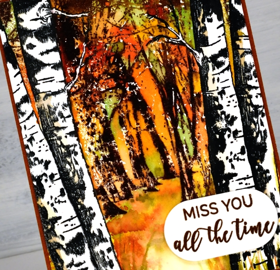 With all the trees embossed I started painting dabs of autumn toned inks around the trees and on the forest floor. The inks are listed below. Once I had the look of autumn leaves around the branches and scattered on the ground I used a white gel pen to draw back in the little birch branches I had accidentally painted over.