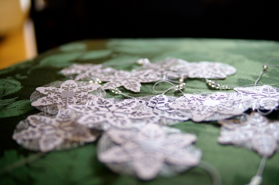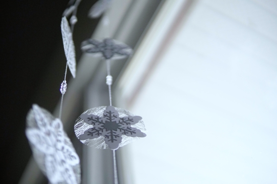 I ended up with six snowflakes on each garland with clear beads grouped on the twine in between the snowflakes. Each snowflake is actually double sided so the twine is glued in between the two and for some I glued a contrasting snowflakes on each side.