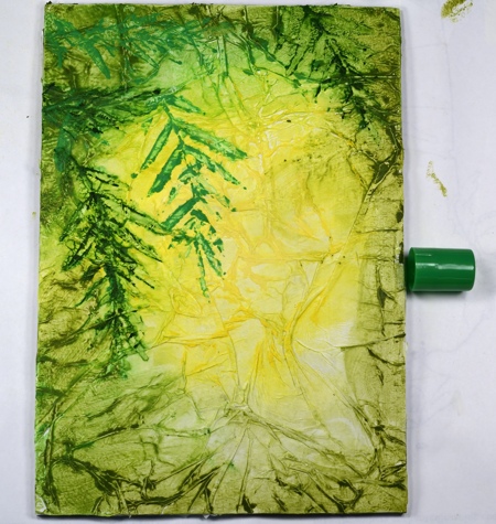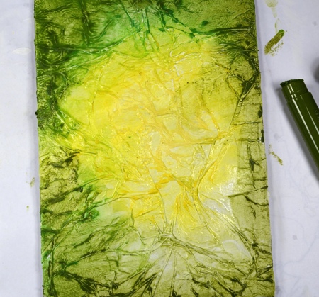 Next I spritzed with water and blended the greens with my fingers through stencil.