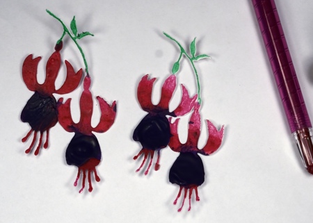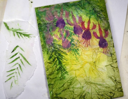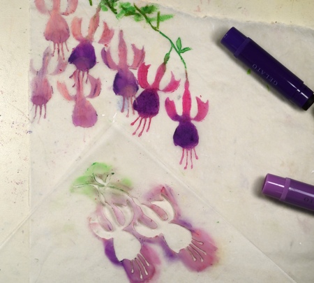 I created another stencil using the Fuchsia die and applied colour to tissue paper with lime, lavender, grape and guava gelatos, then blended with my fingers.