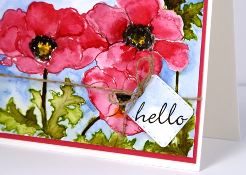 Posted: March 4, 2016 Filed under: gift card pocket, Poppy Gems | Tags: Dr Ph Martin Hydrus watercolor paints, Faber-Castell Albrecht Durer Watercolour pencils, Penny Black creative dies, Penny Black stamps 20 CommentsThe Poppy Gems return today but in a more traditional colour scheme than last week’s card. I stamped with liquid watercolour paint on this panel, a technique not unlike what I often do with the distress stains. I used a paintbrush to apply the paint to the stamp then, after stamping, used water to blend the colour into the petals and leaves. In the centres and shadows on the flowers I layered colour to increase the intensity. The paints are Dr Ph Martin Hydrus watercolours which dry permanent. This feature was helpful when I decided to add a background weeks after completing the flowers. There was no chance I would make the pinks and greens bleed into the sky when I added blue with a watercolour pencil and waterbrush.