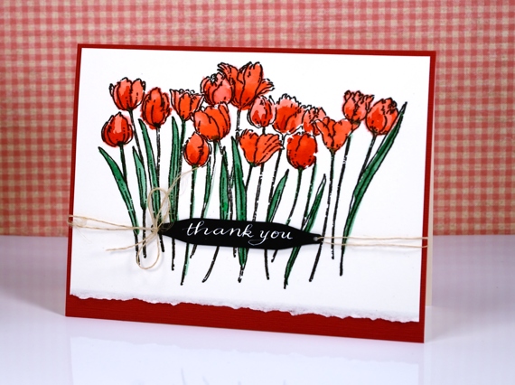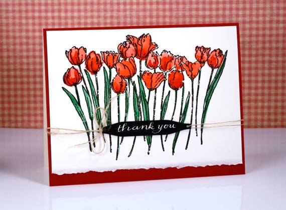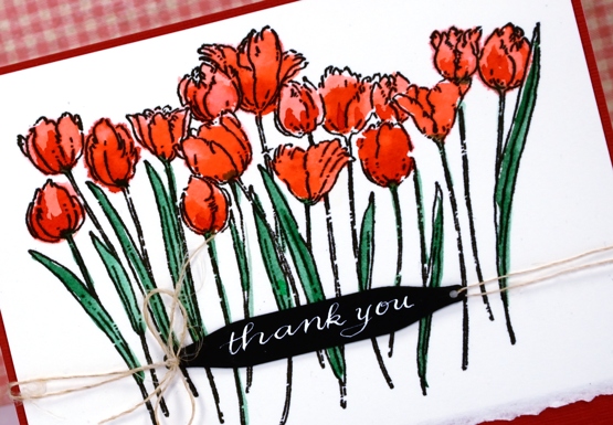 I used a hand lettered sentiment tied on with some hemp twine and framed it all in red to make the tulips pop.