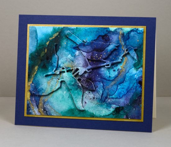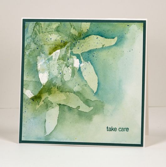 I pressed the frisket film leaves firmly onto hotpressed watercolour paper and painted some greens and blues around the leaves. The shape of the leaves reminds me of gum leaves (eucalyptus leaves) so I stuck with the muted blues and greens I remember from the gum trees in Australia. Some paint did seep under the frisket film in places but I didn’t worry as I knew I was doing several layers anyway. When the first layer was dry I repositioned the mask and repeated the process. I think I repositioned the mask three times; I’m not sure. By the time I had painted several layers the first white masked leaves were almost completely covered in paint but the outlines were still distinct. I added some splatter, a sentiment then matted in a co-ordinating teal cardstock.