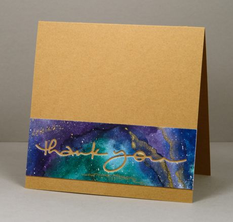 With my last little scrap of the faux marble watercoloured panel I created a CAS card on a kraft base which picked up the gold details. The ‘thank you’ die is another from the new PB release. I stuck the die-cut words inside the card.