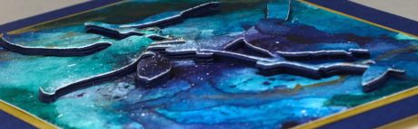 Posted: March 23, 2015 Filed under: CAS, Happy News, Watercolour | Tags: Fabriano Watercolour Paper, Kuretake Gansai Tambi watercolour paints, Penny Black creative dies 19 CommentsPenny Black has a mini release out today and you can see projects featuring the new stamps and dies on the blog and facebook all this week. I have two cards for you featuring the rest of the faux marble watercoloured panel I made last week. It was inspired by Sandy Allnock’s video of her faux glass technique. I used a bird & branch die called ‘Happy News’ from the new release. Rather than use only the die-cut or the negative I wanted to use both so I didn’t lose any of the pretty patterned panel. To raise the bird and branch above the background I stacked six die-cuts out of navy cardstock then stuck the watercoloured die-cut on top. This panel has proved quite hard to photograph; I’m not sure why but it is hard to get the greens to look like they do in real life. I switched to a grey background which lessened the contrast but it still isn’t quite what I see. (blue, green, gold, white-who knows?) To make it easier to stack the die-cuts I stuck scrapbook adhesive sheets on the back of my cardstock before cutting. To finish I matted it on gold cardstock then on a deep blue panel.