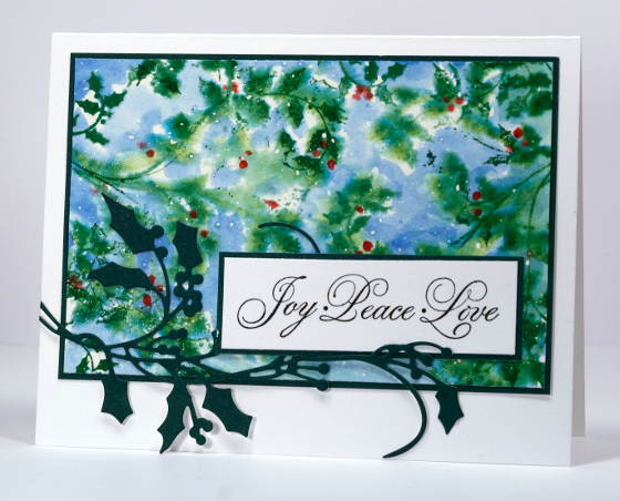 Having said that here is another Christmas card. I created a little holly panel by stamping the “Happy Holly” stamp on damp watercolour paper. I inked the stamp with Memento markers then spritzed it and the paper before stamping. The ink bled into the paper straight away and I spread it even further with a water brush. When it was dry I restamped the holly image and painted the leaves and berries with ink from Memento ink pads. To finish I matted the panel in red, added a sentiment and popped it up over some holly die cuts. An adhesive sheet from Scrapbook Adhesives made it much easier to attach the die cut.
