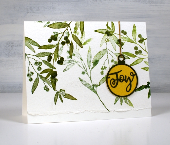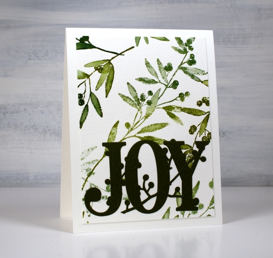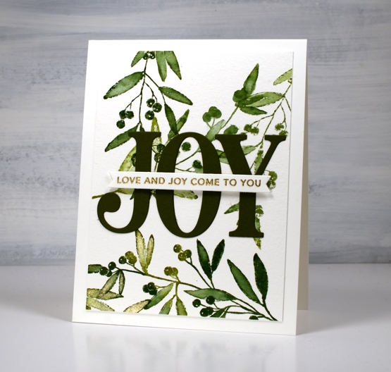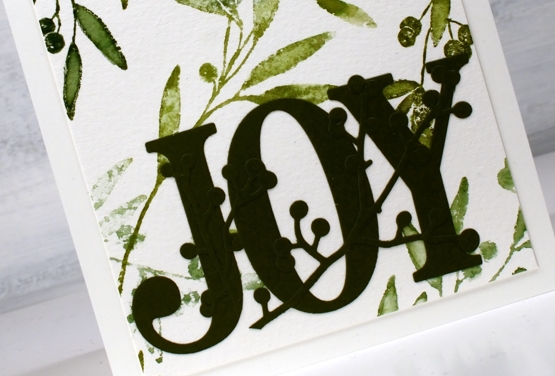 I stamped the green pine needles with forest moss and evergreen bough distress inks and the fine needles in the background with iced spruce. I added some green splatter then some gold splatter using one of the gansai tambi starry colours. I used the ‘jumbo joy’ die from Penny Black to cut out the word joy from the stamped panel and cut three layers from shimmer gold cardstock as well so I could stack them up just a little offset so the gold peeps out on the side.