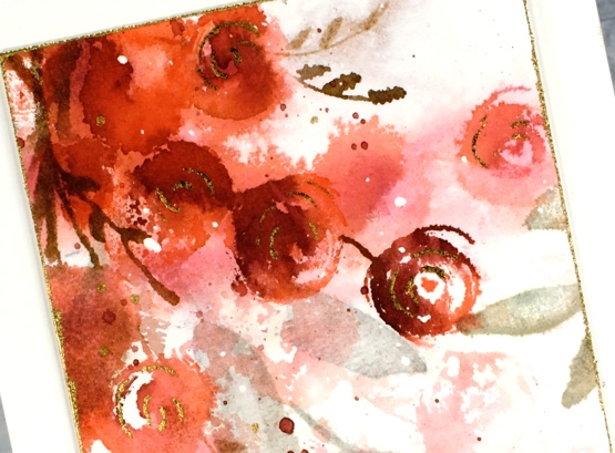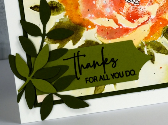 The flowers are stamped in abandoned coral and aged mahogany, the leaves are forest moss and the stems ground espresso. Because I added plenty of water when stamping this panel most of the definition in the flowers was lost so I drew some swirls on the flowers with a glue pen, let it dry to a tacky state then pressed gold foil on top. I added more gold details with an embossed sentiment, a gold cord and gold embossed edges round the panel.
