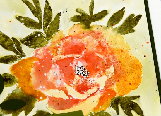 The ‘rosa’ stamp is made up of round flowers and long leaves in an impressionistic style. For this orange and blue card I kept the stamp in the positioner while I worked on the hot pressed watercolour panel stamping the flowers first in fossilized amber and spiced marmalade, the leaves in faded jeans and forest moss and the flower centres in ground espresso.