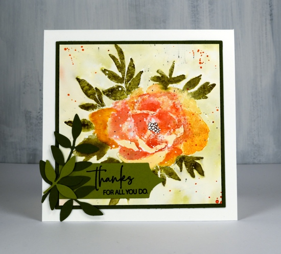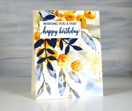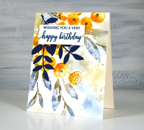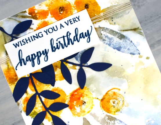 Because I was experimenting with the new stamp I didn’t plan or paint a background for the panel. Once the flowers were finished I decided I wanted some colour around them. Rather than paint some pale washy colour I smooshed the faded jeans and forest moss mini distress cubes on a piece of acetate, spritzed it generously then pressed it onto the panel here and there to transfer ink around the flowers. I finished the card with some twine, blue leaf die cuts and a sentiment also stamped in blue. If you’re wondering why I chose to have blue leaves it’s not just because I love blue. Blue and orange are complementary colours, opposites on the colour wheel so when they are placed next to each other they provide a contrast that makes the other colour pop!