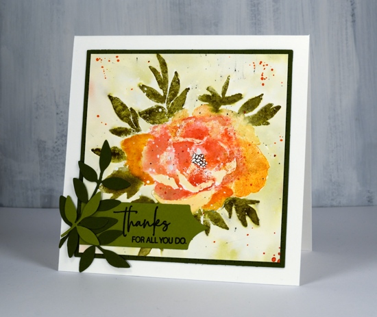 This is ‘Rosa’ a new floral stamp from Penny Black. When I have a new brushstroke stamp I usually reach for the distress inks for the first test drive. That’s what I used for both cards in today’s post and I love the watercolour effects I was able to get.