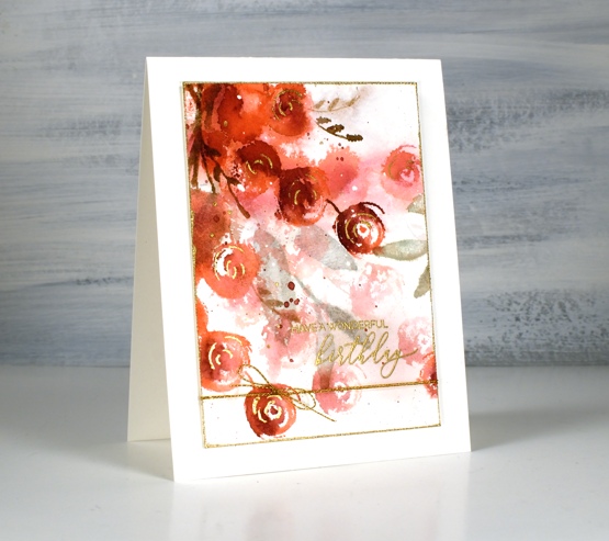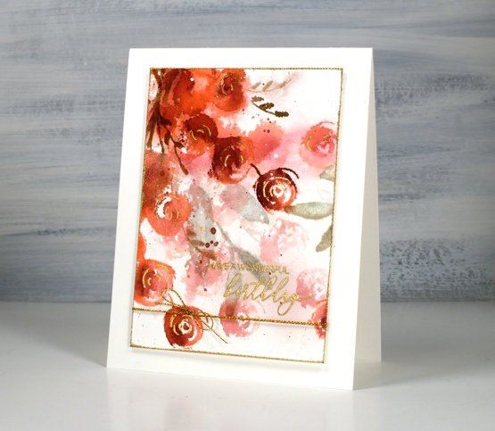 The second card features generational stamping stamping and plenty of spritzing to make the paler background flowers bleed into the surrounding area.