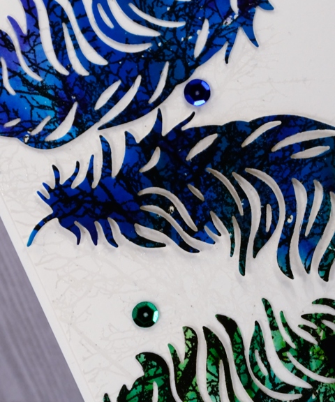 The background is also stamped with the skyward stamp and embossed in clear powder to create a subtle pattern. I popped the feathers up on the background panel, added some co-ordinating sequins and a little embossed sentiment.