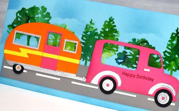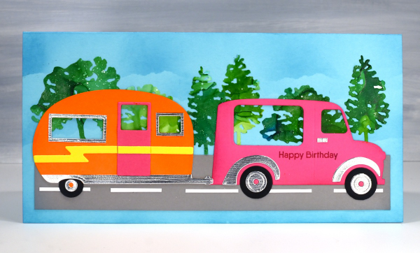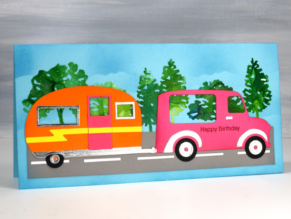 Today’s card has already travelled to a girl who just turned 8! It’s not my usual style but it was definitely fun choosing the colours and cardstock to put this one together. The die sets are both from Penny Black and although they weren’t released at the same time, they are the same scale which made this cute little scene possible. One set is called ‘Campers‘ and the other ‘…is coming‘