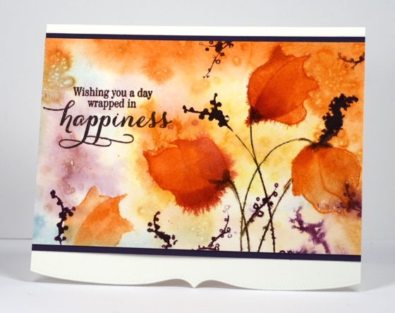 But back to the card at hand. This one was my favourite from the eight I created for CHA. It is hard to see in the photo but it is covered in shimmery sparkliness. I began by wetting the watercolour panel and dropping Victorian Velvet, Ripe Persimmon and Tumbled glass distress stains into the water. I also sprinkled Camargue salt onto the wet areas to create patterns as it dried. All the little dots in the background were created by the salt absorbing moisture and colour. You can try it with any salt you have on hand but different salts will give you different results. When the background was dry I stamped the flowers in Spiced Marmalade distress ink, the stems in Peeled Paint and the little seeds in Dusty Concord. I used both Spiced Marmalade and Ripe Persimmon stains to paint the flower heads, spritzing with pearl-ex spray here and there to make the colour bleed and shimmer. The sentiment and mat strips do look black in the photo but they are both purple to co-ordinate with the seed heads. See that cute little shaped edge? There are two new edge dies in the “Bring on the Happy” release and I hope they will be the first of many. That edge does add that certain something don’t you think?