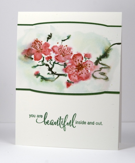 Posted: January 30, 2015 Filed under: CAS, Delicate Blossoms, Stitched Edges | Tags: Penny Black creative dies, Penny Black stamps, Tsukineko Memento inks 13 CommentsToday I have a simple design featuring a sweet new stamp called ‘delicate blossoms’. The new release, “Bring on the Happy” is available in the online store today and it is full of gorgeous new stamps, dies and stencils. To create the little panel above I used Memento inks and markers on watercolour paper. I inked the stamp one colour at a time and used a stamp positioning tool to make sure the stamp landed in the same place each time. I stamped the blossoms with love letter and angel pink and added some water to blend the colours. I let the inks bleed a little but kept flowers fairly well defined. The branch was inked with two greens and then I added water and summer sky ink around the image to spread some background colour but avoided the flowers. Finally I drew the flower centres with a marker. I cropped the panel using one of the new ‘stitched edge’ dies and added a green mat and sentiment.