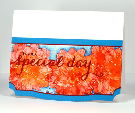 The background is coloured with Faber Castell polychromos pencils in two blues, I also added some extra definition here and there on the petals with red and orange pencils. The bottom edge of the panel, as well as the red, the blue mat and the card base, is die-cut by one of the stitched edges dies. For the sentiment I stamped only part of a stamp from the Sprinke & Smiles set so I could finish the phrase with words die cut in the same red as the mat.