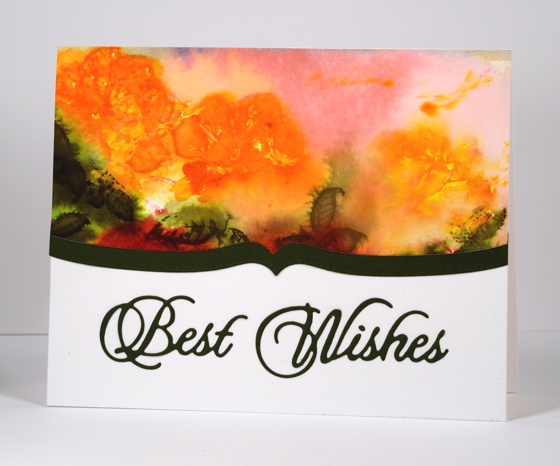 I cropped the red roses out because they were not so pretty then added a shaped border cut with one of the ‘stitched edge’ dies. I put ‘stick it’ adhesive on the back of the green cardstock before I cut the ‘best wishes’ sentiment which makes it very easy to attach to the card base.