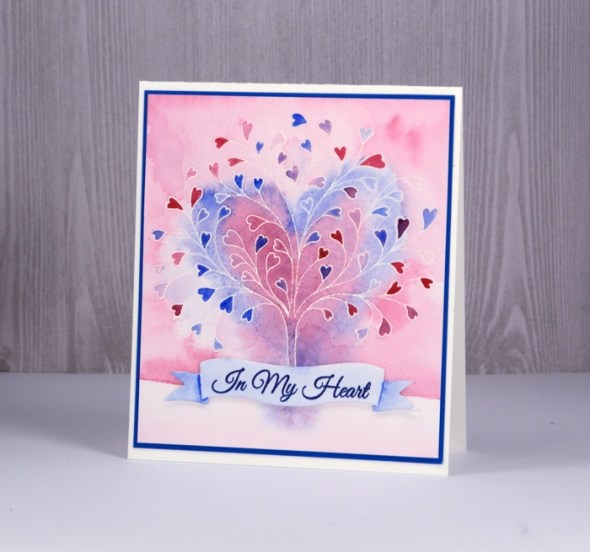 Posted: January 24, 2018 | Author: Heather | Filed under: Tree heart, Triple Banner | Tags: Kuretake Gansai Tambi watercolour paints, Penny Black creative dies, Penny Black stamps, WOW embossing powders | 4 CommentsThis stamp is called ‘tree-heart’ but I always think of it as a family tree. After all what better to have on a family tree but a whole bunch of hearts? I stamped the tree in versamark and embossed with clear powder on hot pressed watercolor paper. Next I painted water over the top section of panel and added pink and blue watercolour paints. Keeping it loose I painted a heart shape over tree with both pink and blue. I filled in the heart leaves with more intense pink and blue paint then painted diluted pink over base area.