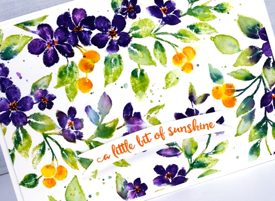 I switched to a paintbrush to blend some of the leaves, berries and petals. When the ink dried I used the spiced marmalade marker again to add orange centres to the purple flowers.