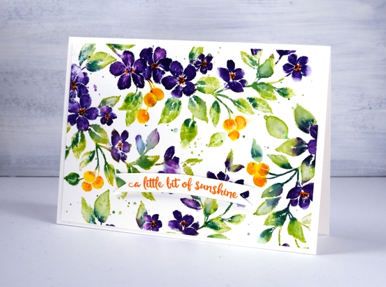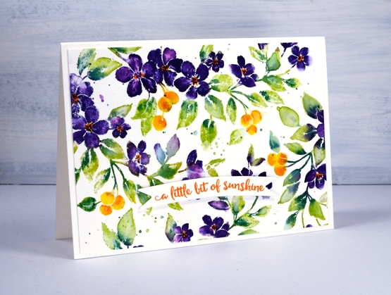 I used a Papertrey ink royal velvet ink cube to ink the flowers and wiped any stray purple ink off the stamp before inking the leaves with green parakeet and the berries with bright buttercup. I spritzed the stamp before stamping so the inks would move a little. Before stamping again I added spiced marmalade distress ink to the berries and pine needles distress ink to the leaves with markers, gave the stamp another light spritz and stamped again.