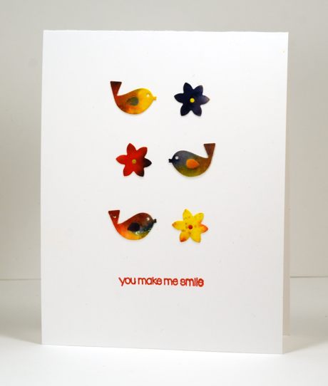 The watercolour panels were left over from my last class so I die cut little birds and flowers using dies from the ‘tweet things’ set to fit with the spring theme then arranged them according to the sketch.
