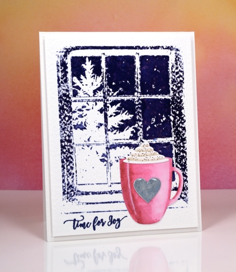 I coloured the cup with red distress inks then added a sparkly embossed snowflake, a teabag tag and some rising steam.