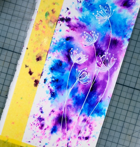 I wanted the area around the flowers to be completely covered in paint so I blended some areas with a paintbrush. Around the edges I left it abstract. The panel was very tall and thin so I ended up with a tall thin card finished with a sentiment popped up over the flower stems.