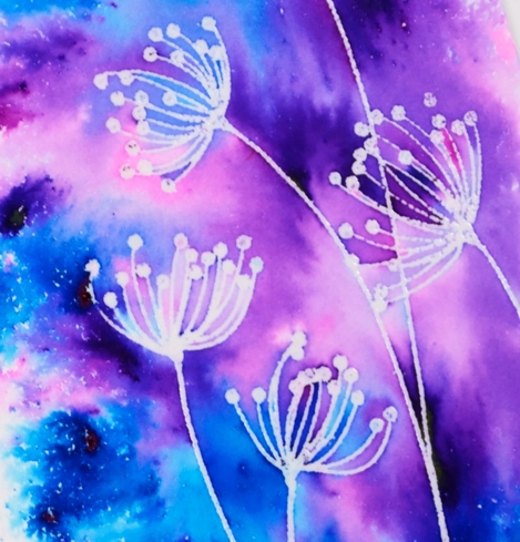I embossed the ‘Effulgence’ stamp on hot pressed watercolour paper in clear powder then sprinkled ultramarine and violet colorburst powders over the panel. I spritzed the panel from above and watched the colour move before adding any more powder or water.