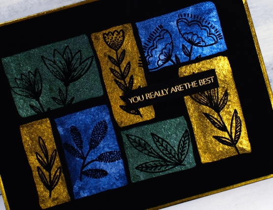 To create today’s card I worked on a panel of cold pressed black watercolour paper with Coliro pearlescent paints from both the ‘ocean’ and ‘earth’ sets. I did not use a stencil to help me paint the shapes this time I freestyled them and tried to keep the edges basically in line with each other. After painting seven shimmery shapes I chose stamps that would fit the shapes. I know it would have made sense to create the shapes to fit the stamps but did I think of that? Ah no. It worked out though with some post-it note masking if a stamp was too big for the shape.